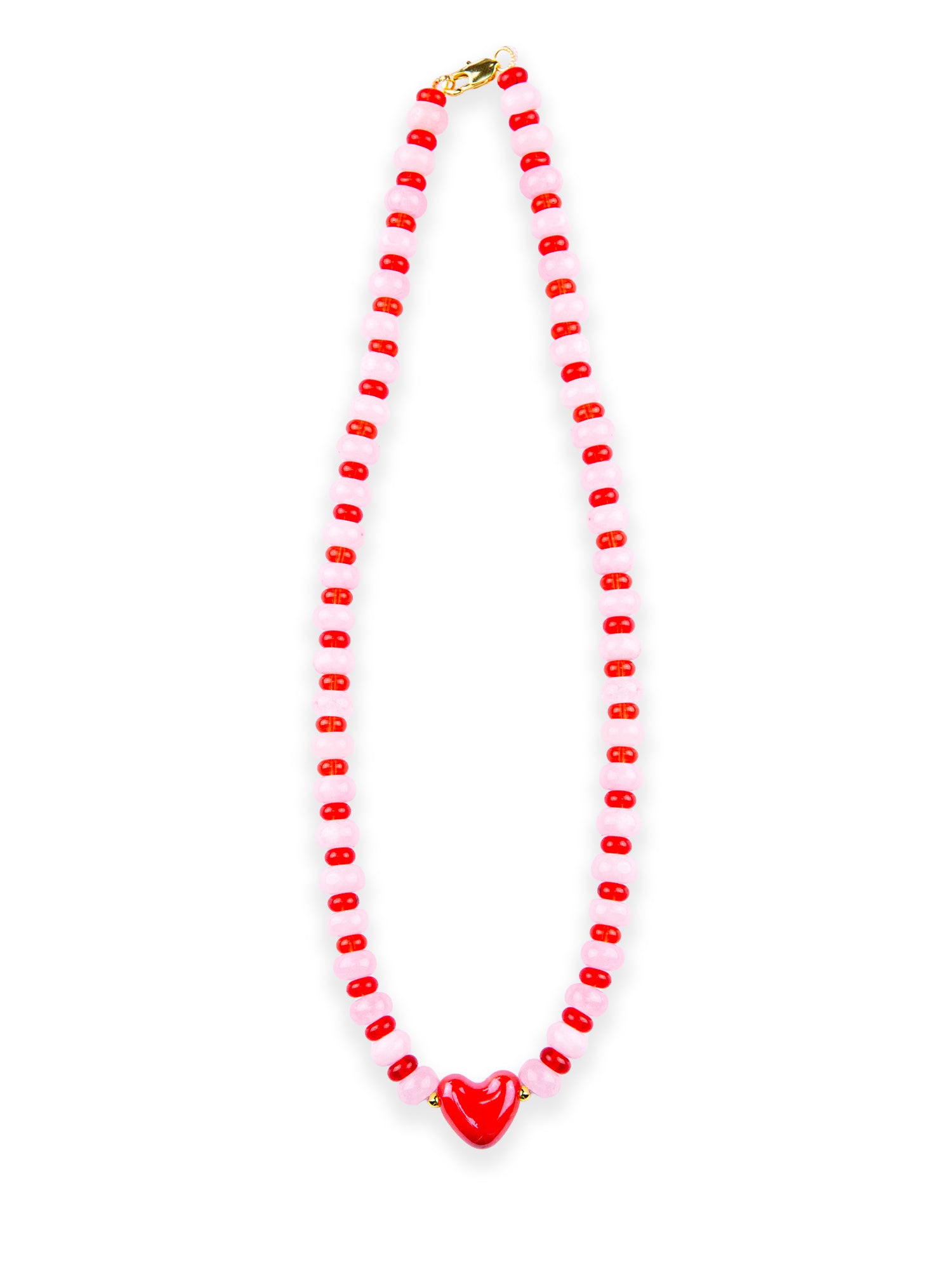 A combination of Candy Rose Quartz and Candy Royal Red beads, finished with a glazed ceramic heart at the centre, accented by two small 18k gold-plated beads on either side.